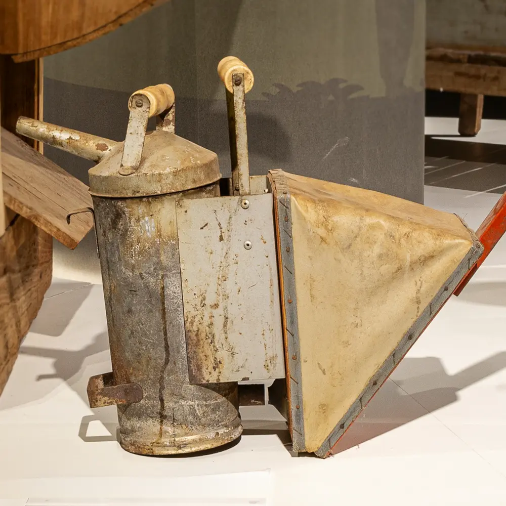 O fumigador, composto de aço, madeira e couro, era utilizado na agricultura para a aplicação de fumaça em colmeias para a extração de mel. Seu mecanismo simples permitia que o ar fosse comprimido manualmente, liberando fumaça de forma controlada. Foi essencial na proteção contra as ferroadas no manejo de abelhas.