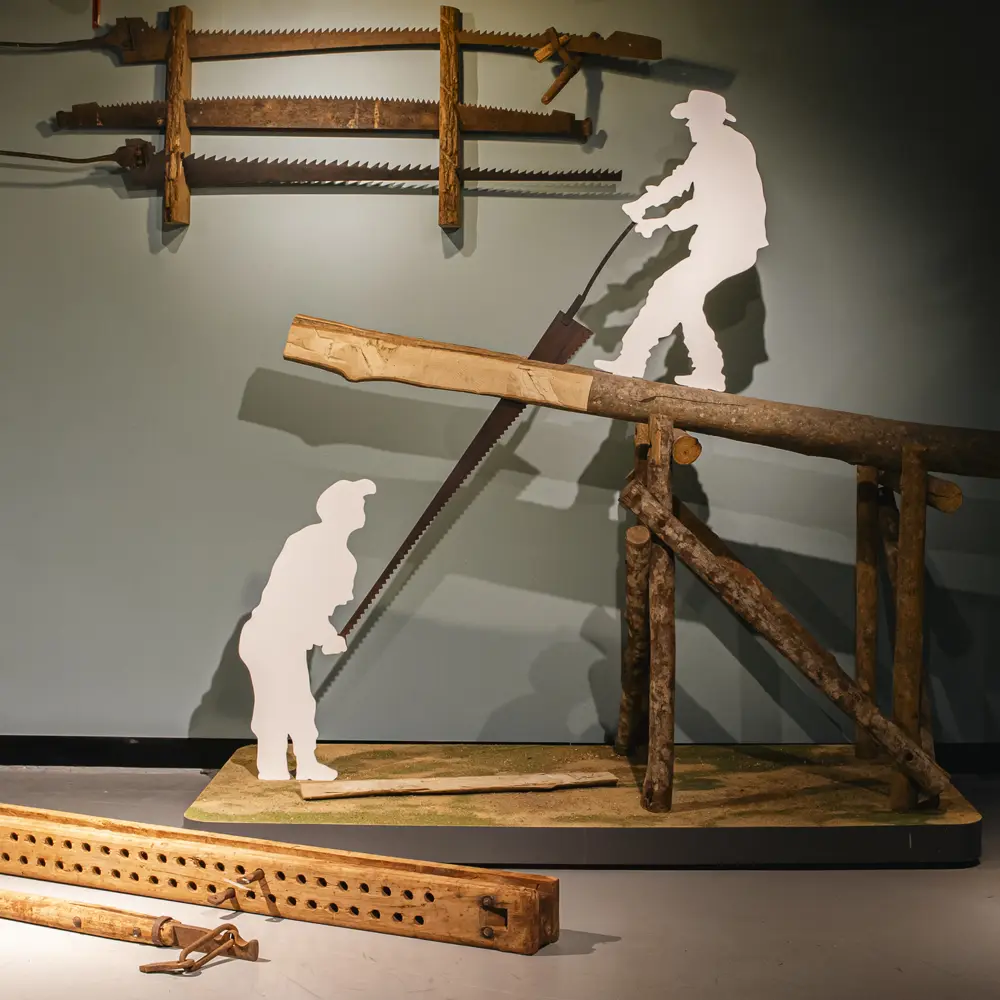 As serras foram essenciais durante o desbravamento das matas com o intuito de dar inicio às comunidades que nasciam. Em contrapartida, o macaco de carregar toras realiza o ato de erguer estes elementos para facilitar o transporte, o corte e a destinação. Cada dente da serra e cada engrenagem do macaco revelam a história de suor e cooperação, onde o ritmo do corte seguia o compasso do trabalho em dupla. São símbolos em que o esforço físico era aliado a técnicas.