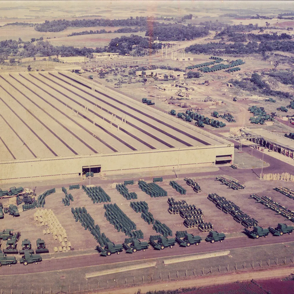 A imagem retrata a unidade da John Deere no Distrito Industrial I de Horizontina, no Noroeste do Rio Grande do Sul, durante a década de 1990. Essa implantação marcou um novo ciclo de desenvolvimento econômico e tecnológico para a região, consolidando Horizontina como um importante polo da indústria de máquinas agrícolas no Brasil. A presença da John Deere impulsionou a geração de empregos, inovação e integração com o setor agroindustrial, fortalecendo ainda mais a identidade local ligada à mecanização agrícola, iniciada através da SLC & Companhia Ltda.